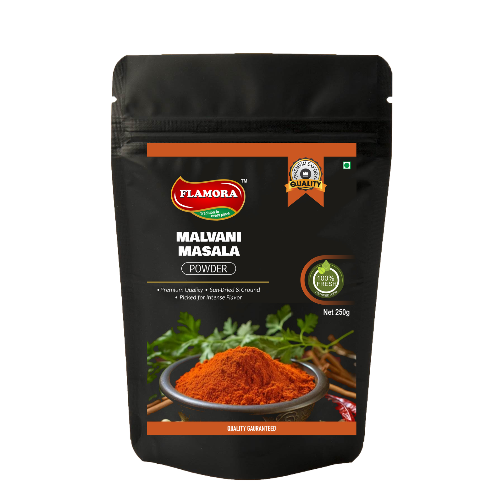 Flamora Malvani Masala Powder is a bold and aromatic coastal spice blend inspired by the rich culinary heritage of Maharashtra’s Malvan region. Crafted from a harmonious mix of premium dried red chilies, coriander, coconut, and carefully selected whole spices sourced from trusted spice-growing regions, each ingredient is expertly roasted and ground to preserve its intense aroma, deep natural color, and robust flavor. Rooted in traditional Malvani cooking, Flamora Malvani Masala Powder delivers a perfect balance of heat, warmth, and earthy richness—authentic, flavorful, and irresistible—bringing the true taste of Malvan to curries, seafood, vegetables, and a wide variety of home-cooked dishes.